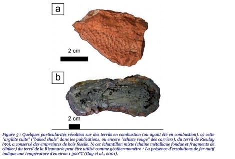 Les roches recuites non fondues (Figure 3) ont des teintes respectivement oranges, rouges, voire violettes, en fonction de l’intensité respective de chaleur qu’elles ont subi. Ceci peut toutefois être nuancé à l’échelle d’un échantillon pouvant montrer différentes paragenèses et états d’oxydation dans la mesure où les vides du terril gouvernent l’apport en oxygène. Ces roches recuites sont couramment dénommées dans la littérature clinker, porcellanite ou encore baked shale ; le terme français est utilisé par les carriers et comme dénomination commerciale : "schiste rouge".