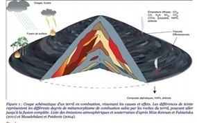 Figure 1 : Coupe schématique d’un terril en combustion, résumant les causes et effets. Les différences de teinte représentent les différents degrés de métamorphisme de combustion subis par les roches du terril, pouvant aller jusqu’à la fusion complète.