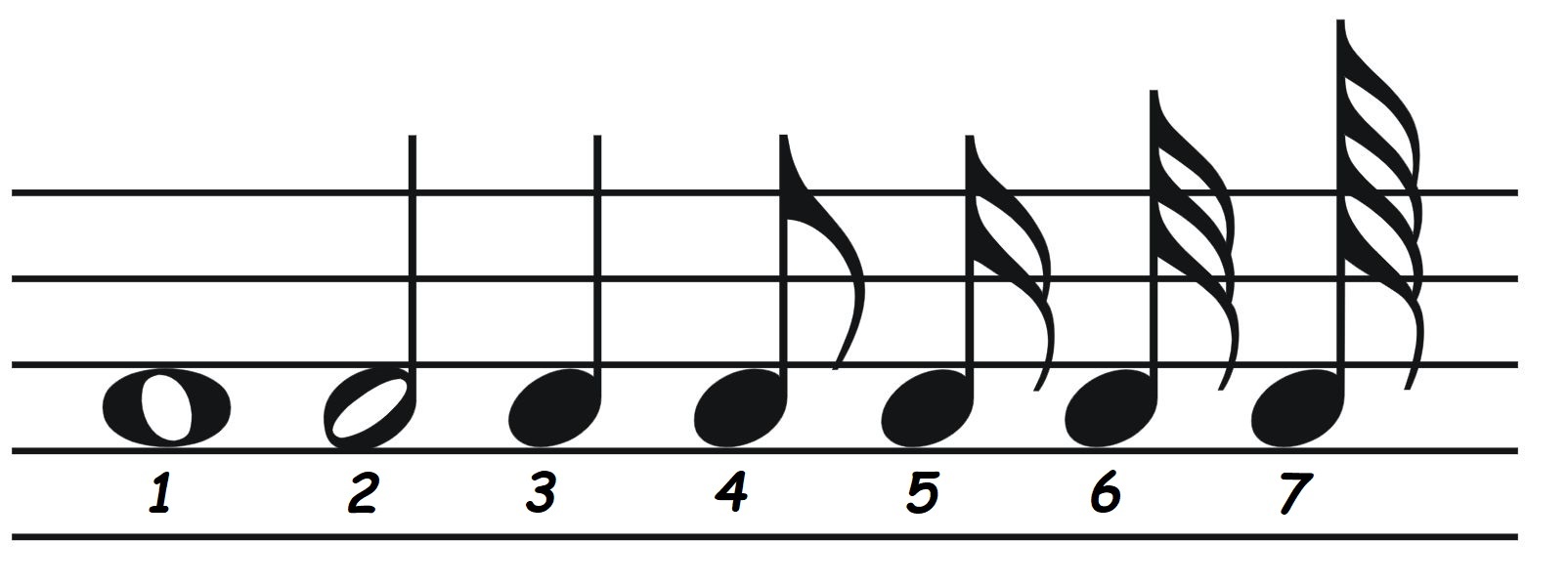 Noty nám určují délku tónů. Rozdělujeme je na: (viz. obrázek níže)