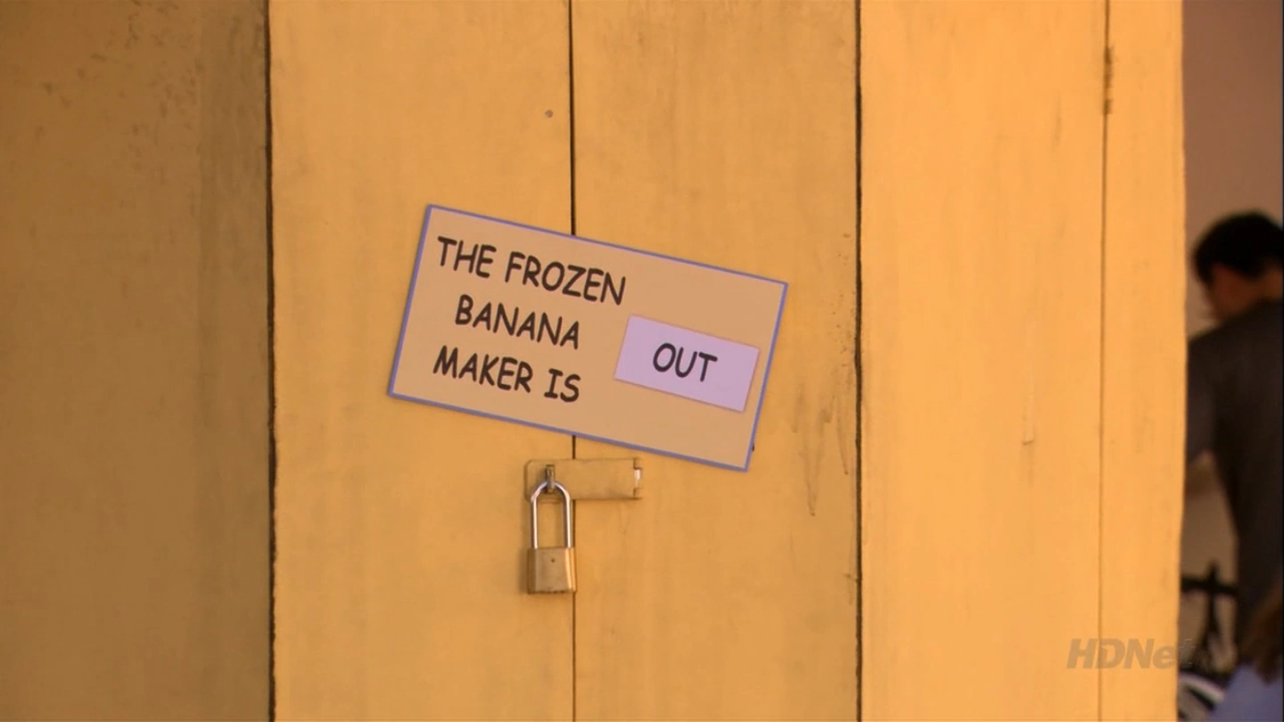 The 1963 ribbon cutting for the banana stand by George is shown in a flashback. ("The One Where They Build a House") George Michael closes the banana stand so he can have brunch with Ann. The sign reads: "The frozen banana maker is out", in the style of Peanuts. ("Good Grief")