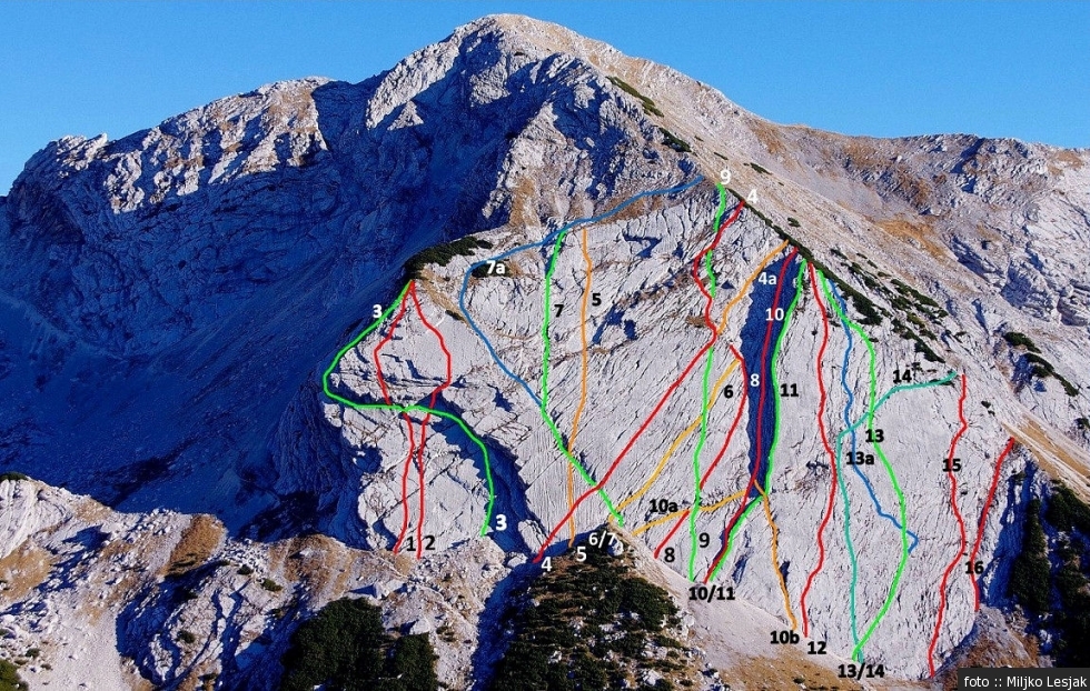 The wall, called Škrbina Plate, is best observed in its entirety from the opposite summit of Tolminski Migovec. At the foot at the altitude of 1600-1650 m, it is approximately 300 m wide, its height in the central section is approximately 200 m. It is highly unlikely that it had been cut with a knife. An aerial view reveals that much of the material, missing in the slope, has filled the narrow valley under Tolminski Migovec (see the photos above). Škrbina Plate is thus the result of a process that changed the southern face of the mountain many years ago. The same process was witnessed live in 1950 by the horrified villagers of Jablanica in the slope of Javoršček (yes, it is exactly what you noticed above Bovec and were afraid to ask what it is).