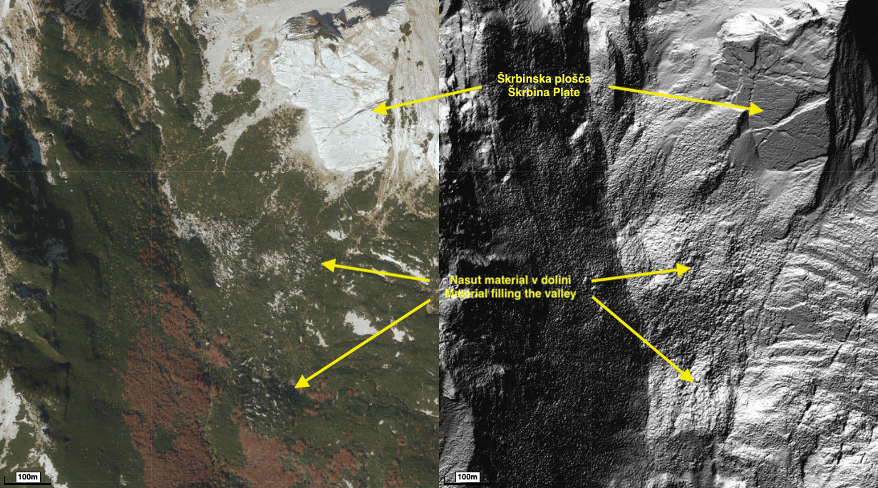 Posnetek iz zraka in LIDAR posnetek lepo prikažeta nasutje materiala v dolinici pod Migovcem.
