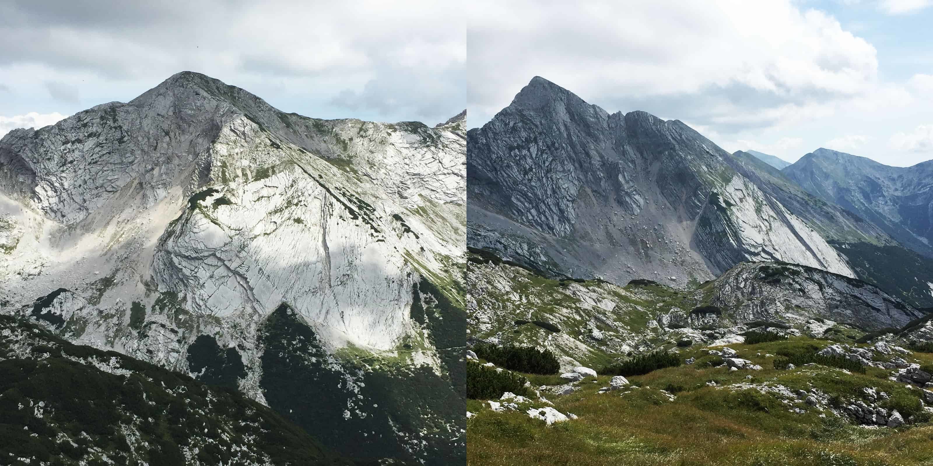 Škrbina Pass Peak and Škrbina Plate. Layered rock is visible on the side view.