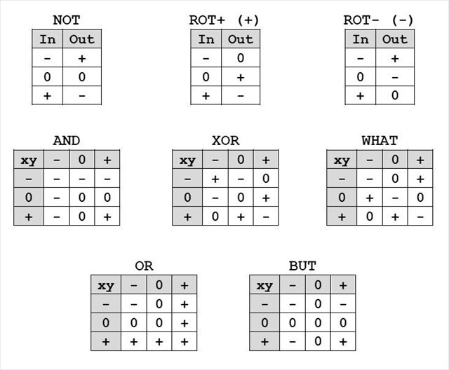 There have been attempts over the years to use balanced ternary logic in computers. Ternary logic gates are be very powerful. Unfortunately, not everyone defines the ternary gates in the same way. For the purposes of this puzzle, here are some gates: