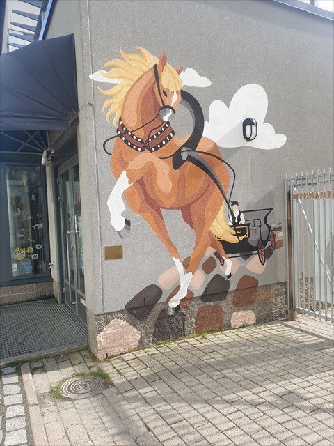Alkupisteellä näet Miia Miettisen 1.6.2020 valmistuneen Vossikan reippaat askelet kaikuvat katukivillä muraalin.