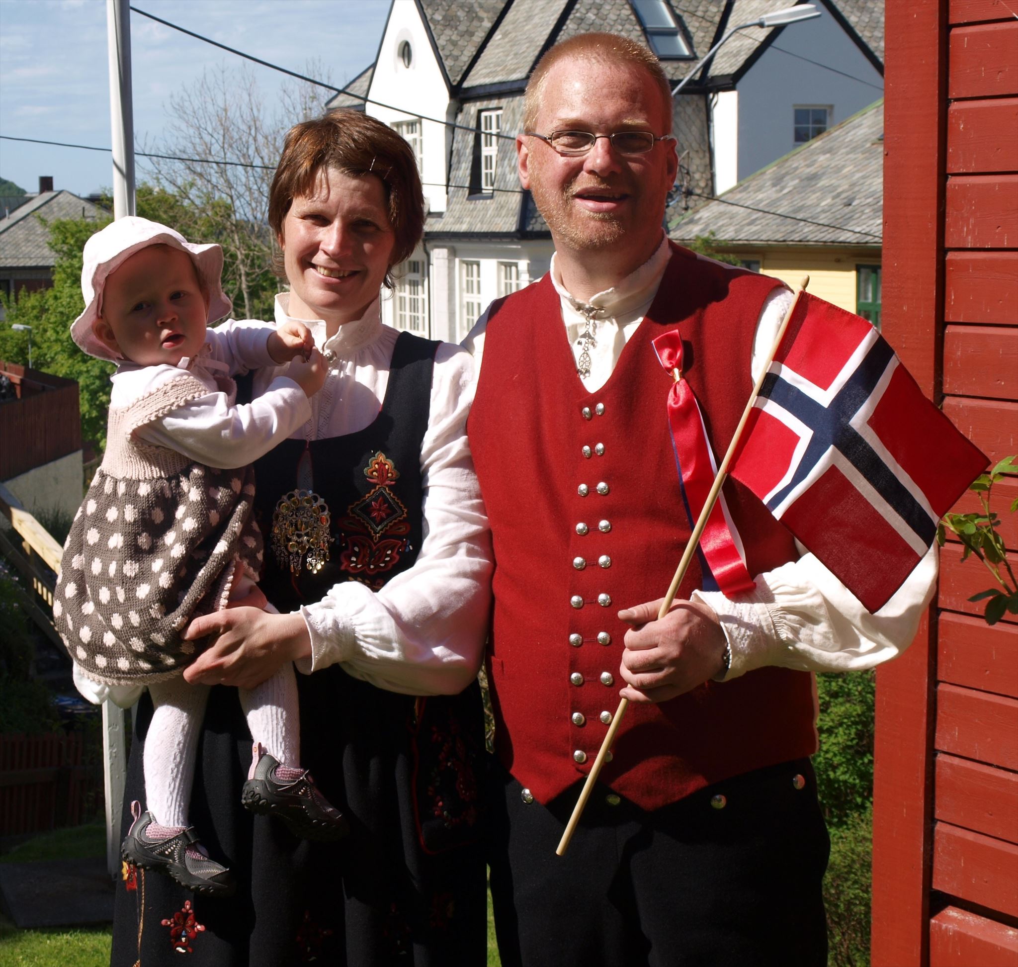 Bildet viser cacheeier og frue med Klompen på arma 17.mai i 2009, forøvrig Klompens ett-årsdag. Konemor har på seg en Ørskogbunad og jeg en..... Sunnmørsbunad. Nå er den hengt vekk i påvente av at jeg en dag skal komme inn igjen i den!
