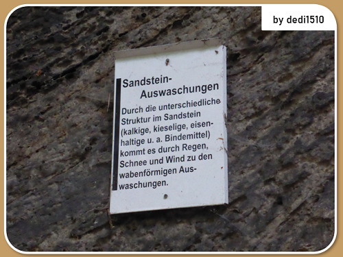 Mache ein Foto von dir oder deinem GPS an der Gewittergrotte. Im Hintergrund sollte die Tafel mit den "Sandstein-Auswaschungen" zu sehen sein. Hinweis: Nach den neuen Regeln darf ein Foto wieder gefordert werden und ich finde es gehört beim Earthcache einfach dazu.