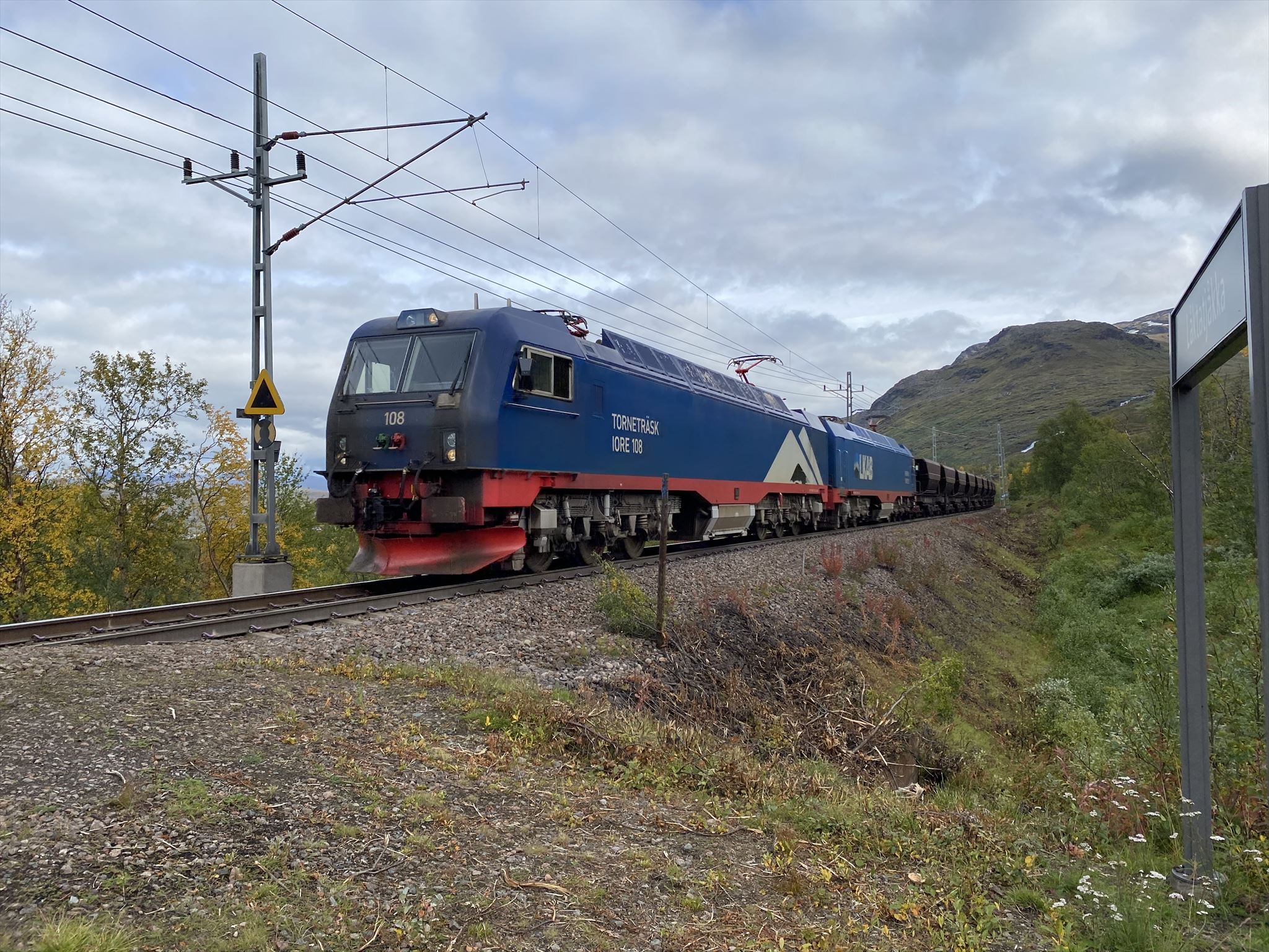 Det går ikke så ofte persontog her, men malmtogene går veldig ofte og det oppfordres til og være veldig forsiktig og vise stor aktsomhet nær jernbanen. Stopp opp og både lytt og se etter tog når du skal krysse toglinjen!
