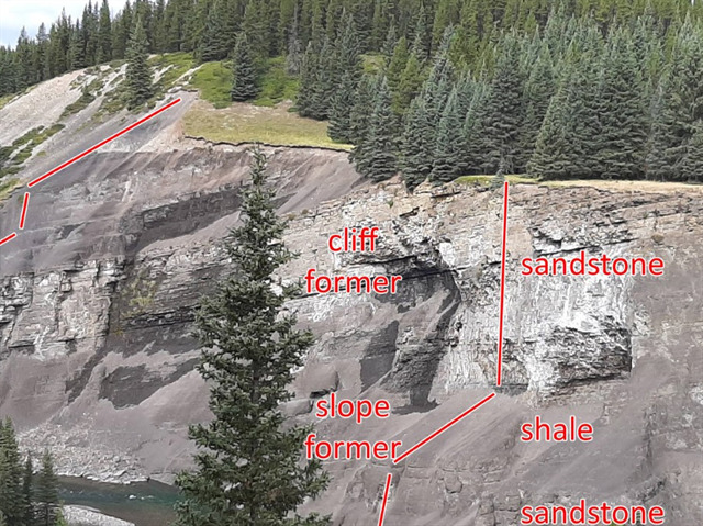 The Ram River valley is made up of layers of sandstone and shale. They erode at different rates.