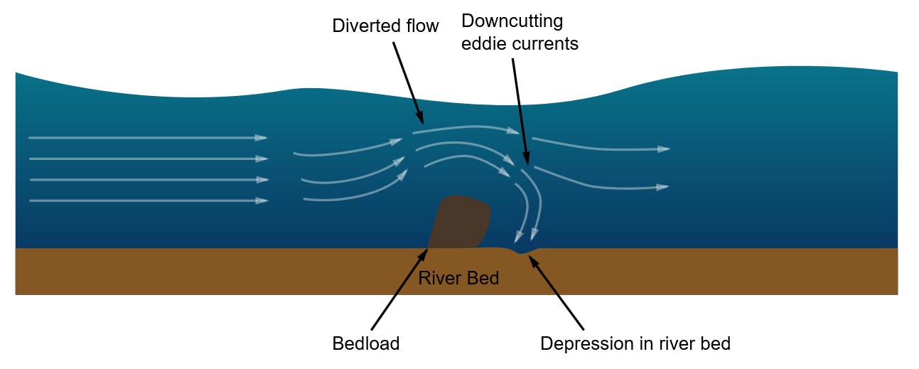 As these depressions deepen, pebbles can become trapped in them. As a result of the eddie currents, the pebbles drill into the depressions making them more circular, wider & deeper. Pebbles will only be able to erode a river’s bed though if the rock the pebble’s made of is stronger than the rock the river bed is made of