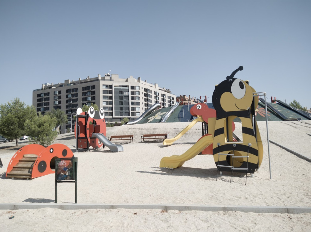 Cuenta con una zona para lo más peques con columpios, pequeños toboganes que caen de estructuras con forma de abeja, gusano y mariquita y otros elementos..