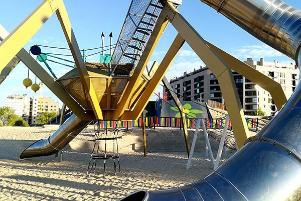 Pero la atracción más famosa y más vistosa del parque es una una araña gigante rodeada de estructuras de insectos, que domina todo el parque y que invita a trepar por ella y bajar por sus enormes toboganes de tubo. De hecho, el parque también se conoce entre los que viven en el Ensanche y alrededores como "El Parque de la Araña"
