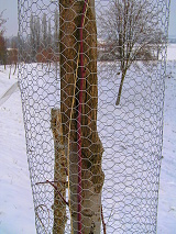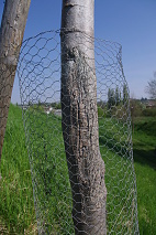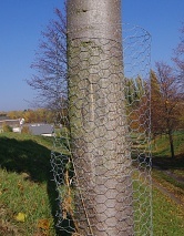V začátcích jsem první stromky prostě jen přesadil na vytipované místo a bylo. Teprve, když mi je (kromě prvního Kaštanu) všechny okousala zvěř, jsem pochopil, že je musím nějak ochránit a začal jsem ke každému dávat pletivo a kůlek. Výrazná plastová pletiva mi však často mizela a vystavovala stromky poničení. Nakonec jsem objevil pletivo, které vydrží a nepoutá příliš pozornosti (zatím zmizelo jen jednou) – takzvané králičí pletivo (s co největšími oky), které vždy nastříhám na potřebný rozměr. Jsou však nižší, takže je musím v období, kdy je stromky začnou přerůstat a zvěř by jejich terminál mohla okousat, nastavit. Pletivo nesundávejte, dokud nebude mít stromek obvod minimálně 40 cm – jinak mu hrozí zničení tzv. „loupáním“ kůry zvěří (stalo se mi několikrát).