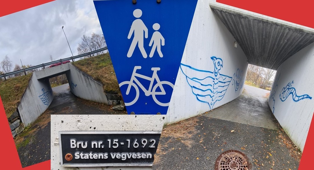 ...den ER det! Bare noen meter, men nær altså! Undergangen gir deg en sikker måte å krysse en trafikkert vei. Statens vegvesen kaller undergangen en bro, men noe navn har de ikke gitt "broa". Jeg velger å kalle det en undergang.