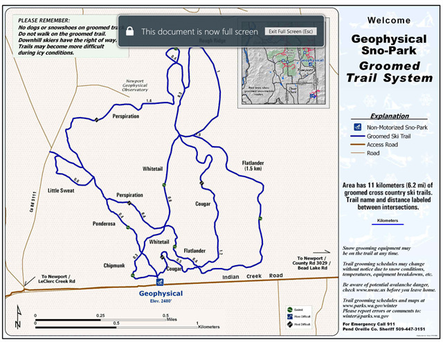Welcome to Geophysical Sno-Park! This popular Nordic trail system just outside Newport, WA offers 6.2 miles of rolling terrain with a few steep pitches through stands of Douglas fir and ponderosa pine, providing many viewing opportunities of wildlife. Deer, bear, elk and many other mammals and birds have been seen in the area. The trails are groomed weekly during the winter months and are part of the Washington State Sno-Park System. The trails also provide opportunities for hiking, mountain biking and horseback riding during the summer months. Each trail intersection is well-marked with trail names and distances. There is no parking or access fee during the summer. In the winter you need a Sno-Park pass, to help with the costs of grooming the trails.