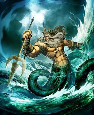 El Dios Poseidón es el rey de todos los medios acuáticos, el dios del mar. Es hijo de Cronos y Rea y hermano de Zeus. Su forma romana es Neptuno. Es uno de los Tres Grandes (Zeus, Poseidón y Hades). Su carácter aterrador, irritable y caprichoso, casi obliga a su adoración, sobre todo a los navegantes, que le invocan para salvaguardarse de mareas, terremotos y tormentas de alta mar.