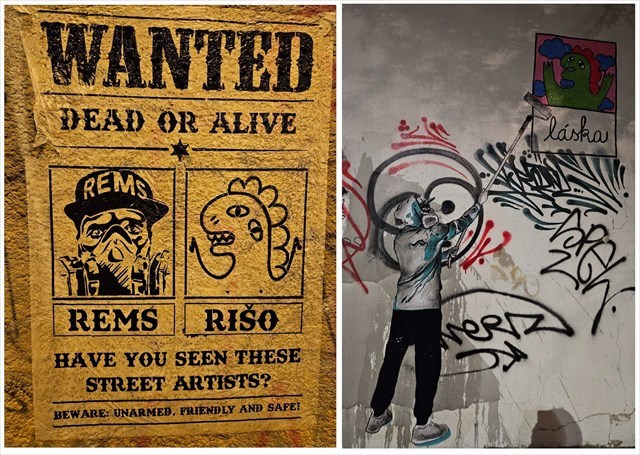 dievča s muchotrávkou, Klaudia Nálepka (sticker). Autorom tohoto (po)uličného umenia (street art) je tatér mklk_huba_art. Na papier je podľa šablóny nasprejovná predloha, ktorá je prípadne dotvorená farebnými sprejmi, vystrihnutá a nalepená na exteriérový objekt. Ojedinele je tento obrázok cez šablónu nasprejovaný rovno na objekt. Najstarší záznam o Klaudii sa mi podarilo nájsť z roku 2011. Naše dievča vzniklo niekedy v období medzi júlom 2017 a októbrom 2018. O čo sa jedná pri nálepkách? Väčšinou sú to naozaj malé pokreslené alebo popísané kúsky papiera s lepivou zadnou stranou, ktoré často "krášlia" pouličné lampy, elektrické stĺpy, odkvapy, elektrické skrinky, dopravné značky, ale aj múry domov,... Jedna nálepkovačka hovorí: „Nálepka pro mě funguje na principu tagu, kudy chodím, tak ji umísťuji a značím si tak své teritorium.” Podľa wikipédie (po)uličný umelci dokonca cestujú do zahraničia aby šírili svoj design. Dievča s muchotrávkou môžete nájsť všade tu, a inde.