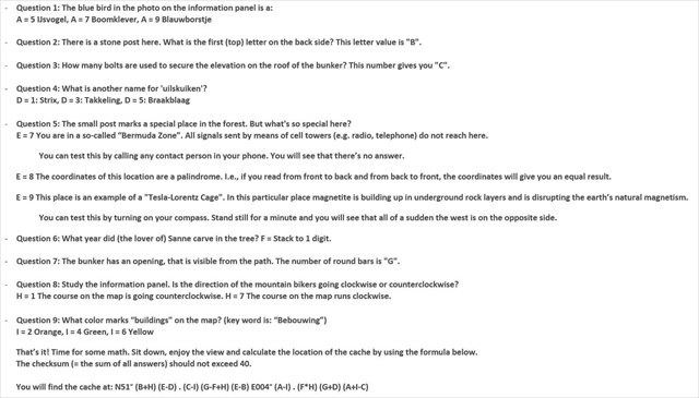 Dat was het! Tijd voor wat wiskunde. Ga zitten, bewonder het uitzicht en bereken aan de hand van de formule hieronder de locatie van de cache. De checksum (= de som van alle antwoorden) zou niet hoger mogen zijn dan 40.