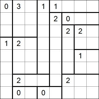 - Je-li vytvořena přímá (vodorovná nebo svislá) řada sousedících bílých buněk, nesmí obsahovat buňky z více než dvou místností; jinými slovy je zakázána jakákoliv taková řada bílých buněk, která spojuje tři nebo více místností.