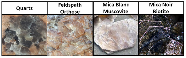 - M comme Mica : opaque en feuillets brillants, il peut noir (biotite) ou nacré blanc (muscovite)