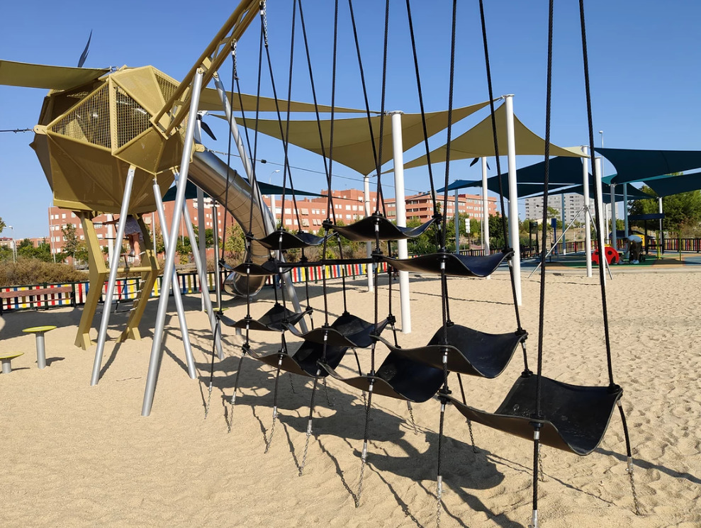 También cuenta con columpios, zona de equilibrios y una zona con suelo de caucho para los más pequeños, con diferentes balancines, elementos giratorios, columpios con cesta…