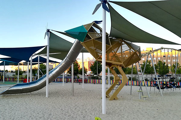 En cada una de estas maravillas, habitan personajes gigantes (como un enorme pez espada, un súper pájaro-tobogán , una araña gigante o un inmenso pulpo-nautilus) rodeados por tirolinas, toboganes increíbles, columpios de diversas formas y asientos, areneros, zonas de escalada, balancines, redes para trepar y muchos otros elementos de juego. Todos tienen pavimentos de caucho y arena e invitan inmediatamente a los niños a jugar y explorar.