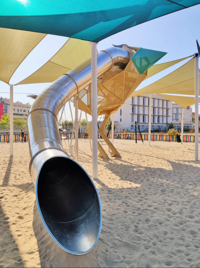 El parque cuenta con una gran estructura con forma de pájaro. Los niños pueden acceder a ella escalando para después bajar por un tobogán de tubo o en una de las dos tirolinas que salen en las alas.