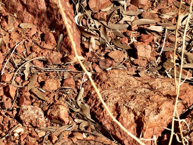 Okay, auch ein Cache bewegt sich nicht. Doch wie macht man es, dass man aussieht wie die Umgebung? Unauffällige Farbe hilft weiter. Unauffällige Form auch. Wenn es etwas gibt, was in der Umgebung auffällig häufig ist - wie die rötlichen Steine und die dünnen Stöckchen in Kata Tjuta - tarnt es, genau so auszusehen. Das gilt auch für diesen Cache. Er hängt an etwas, das in der Umgebung häufig vorkommenden Objekten gleicht. Allerdings befinden sich diese Objekte nicht an Stellen wie der des Caches.