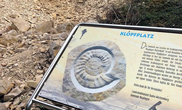 In knapp 1 km Entfernung gibt es bereits einen EarthCache von Donaubiber GC2AJND "Nusplinger Plattenkalk" (unbedingt zu empfehlen), allerdings als Lehrpfad angelegt und um allgemeine Infos rund um dieses Gebiet zu geben. Wir gehen da noch etwas weiter in die Details, ohne jedoch mögliche Antworten auf die Fragen im Listing von Donaubiber preiszugeben. Wir gehen daher mal zum Klopfplatz und machen uns auf die Suche nach Fossilien. Der Bereich ist offen für jedermann jederzeit frei und kostenlos zugänglich. Nur hier an den Listingkoordis ist eine Suche erlaubt; ... siehe dort auch die entsprechende Hinweistafel.