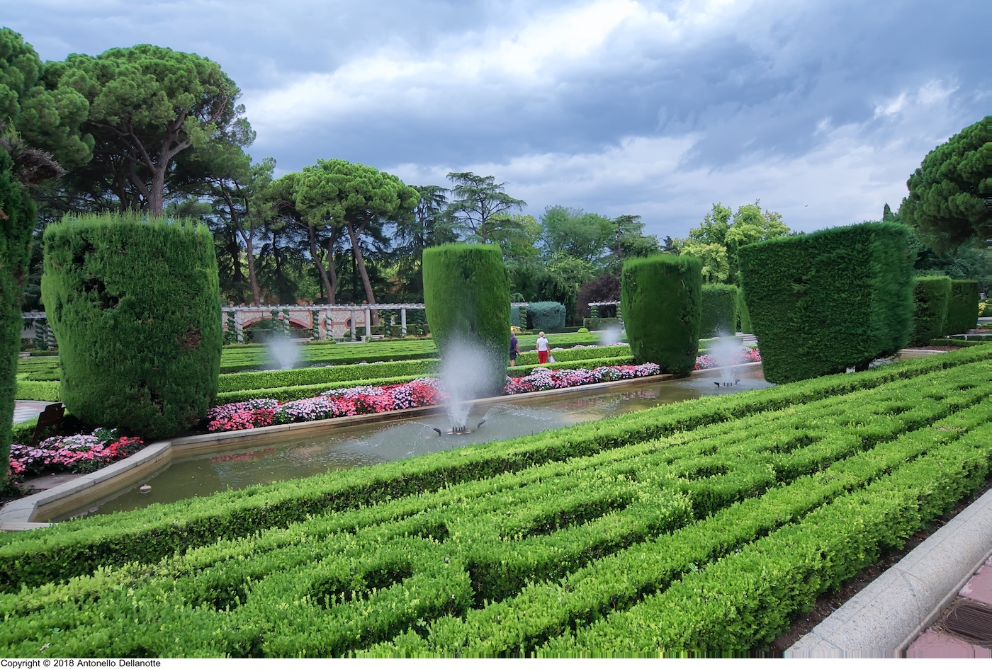 La zona central con losetas ajedrezadas, presenta cuatro estanques provistos de surtidores y rodeados de cipreses de Monterrey recortados formando setos. Destacan las largas pérgolas con columnas rodeadas de hiedra y bancos de piedra.