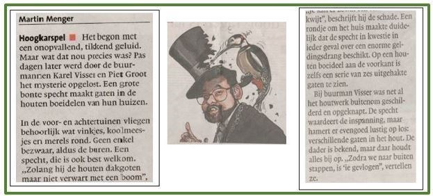 Het onderwerp van deze cache ontstond door een gebeurtenis die wij in januari 2020 meemaakten. We werden toen opgeschrikt door een hamerend geluid. Het bleek een grote bonte specht te zijn die met zijn snavel de boeidelen van ons huis onder poten nam. We hebben geprobeerd de specht weg te jagen, te verleiden met voer op enige afstand van onze woning. Helaas zonder succes. We begrepen dat de specht zijn territorium aan het afbakenen was en wij hem wellicht in verwarring konden brengen door nepspechten te plaatsen. Dit zou voor hem betekenen territorium al in gebruik. We hebben er twee opgehangen en …dat lijkt tot nu toe een succesmiddel. Het Noord-Hollands Dagblad schreef er een flink artikel over . Enkele dagen later verscheen er nog een cartoon met daarop de burgemeester van Drechterland die belaagd wordt door de specht. Wie weet is de specht verkast naar het gebied waar deze cache ligt.