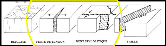 - Fentes de tension : Elles apparaissent souvent en compagnie des stylothites. Presque toujours elles sont remplies de cristallisation de calcite.