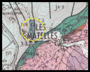 The Matelles slab is visible in the bed of a river (La Déridière) occasionally (water only after heavy rains such as the Cévennes or Mediterranean episodes). This slab is placed along a small fault (Lirou fault) which joins the large Matelles fault.