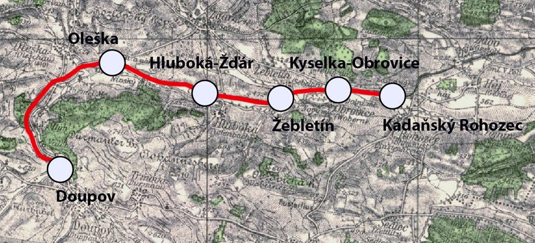 Mapa zaniklé části tratě do Doupova s vyznačenými zastávkami