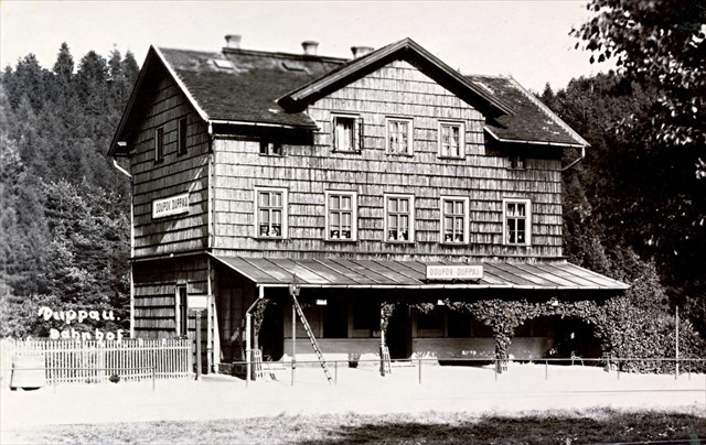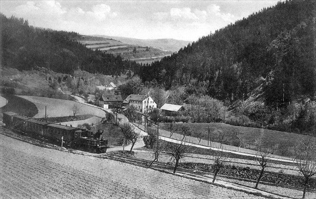 | Doupovské nádraží a osobní vlak směřující do Doupova |