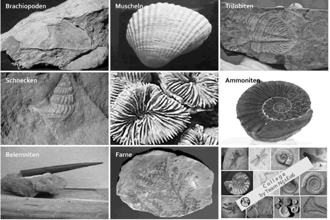 Die folgende "Collage by Team N51E06" zeigt exemplarisch einmal die verschiedensten und bekanntesten Fossilien und Abdrücke mit den Bezeichnungen aus der versteinerten Urzeit. Sie alle an dieser Stelle zu analysieren, würde den Rahmen dieses Listings sprengen und daher konzentrieren wir uns mit diesem EarthCache nur auf eine spezielle Art von Fossilien, welche an diesem Ort zu finden sind.
