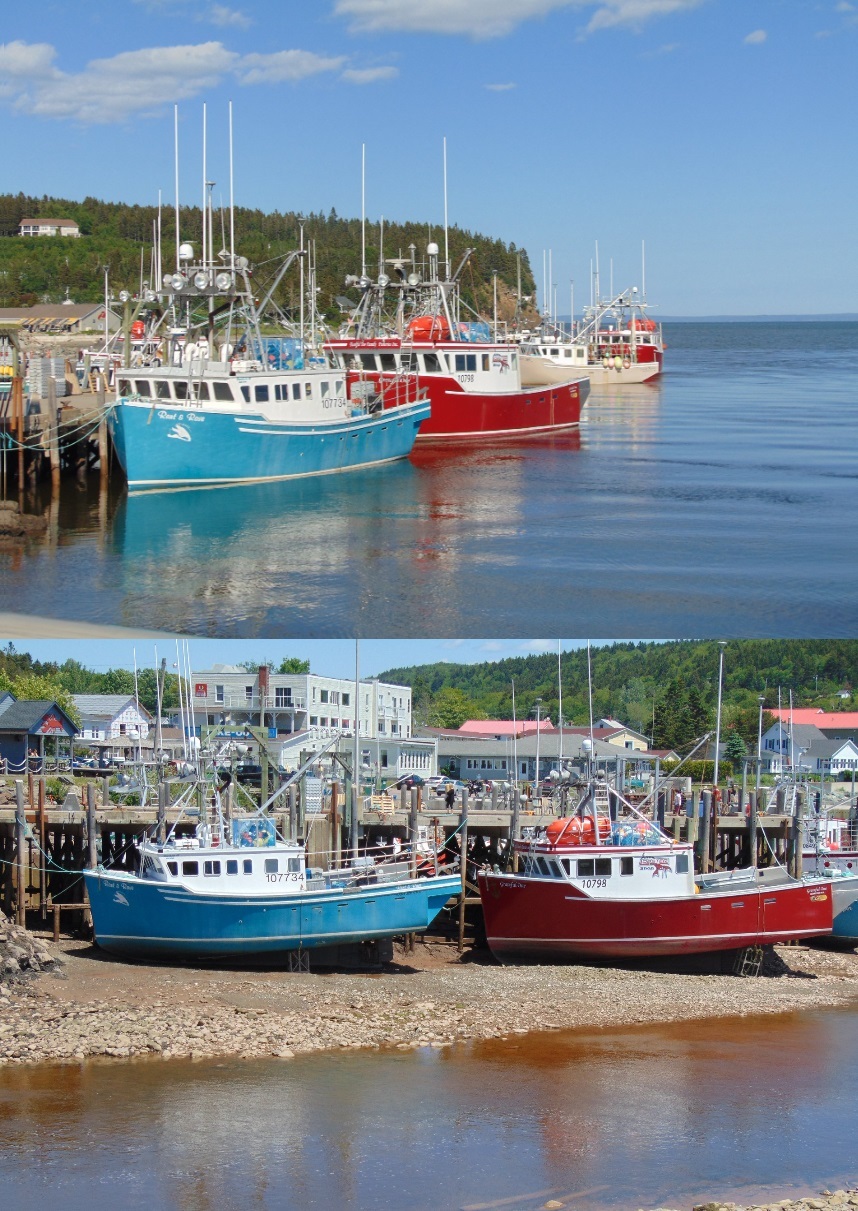 The Bay of Fundy has the highest tides in the world which can be up to 16 meters, the height of a 5 story building! It is located between New Brunswick and Nova Scotia and is 170 miles of craggy cliffs, thundering waves, and ecological wonder. Tides are the periodic rise and fall of the sea caused by the gravitational pull of the moon and the sun on the Earth. Fundy’s tides are the highest in the world because of an unusual combination of factors: resonance and the shape of the bay. The water in the Bay of Fundy has a natural resonance (rocking motion) called seiche. You could compare this to the movement of water in a bathtub. Although the water in a bathtub sloshes from one end to the other and back again in a few seconds, it takes about 13 hours for the water in the bay to rock from the mouth of the bay to the head of the bay and back again. As the ocean tide rises and floods into the bay every 12 hours and 25 minutes, it reinforces the rocking motion. The shape and bottom topography also contribute to the high tides. The bay becomes narrower and shallower toward the upper bay and as a result water is forced higher up onto the shores.