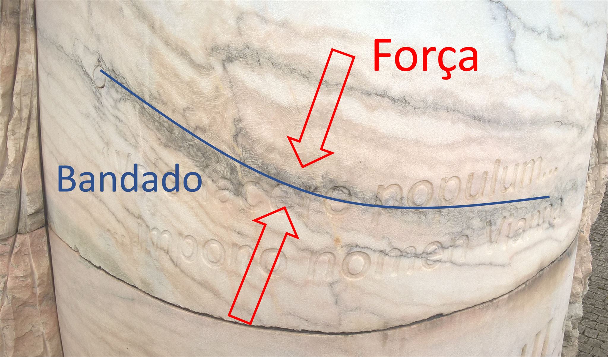2) Na face da coluna virada a sul, os bandados do mármore são horizontais, verticais ou diagonais? A força que deu origem a este alinhamento foi horizontal, vertical ou diagonal?
