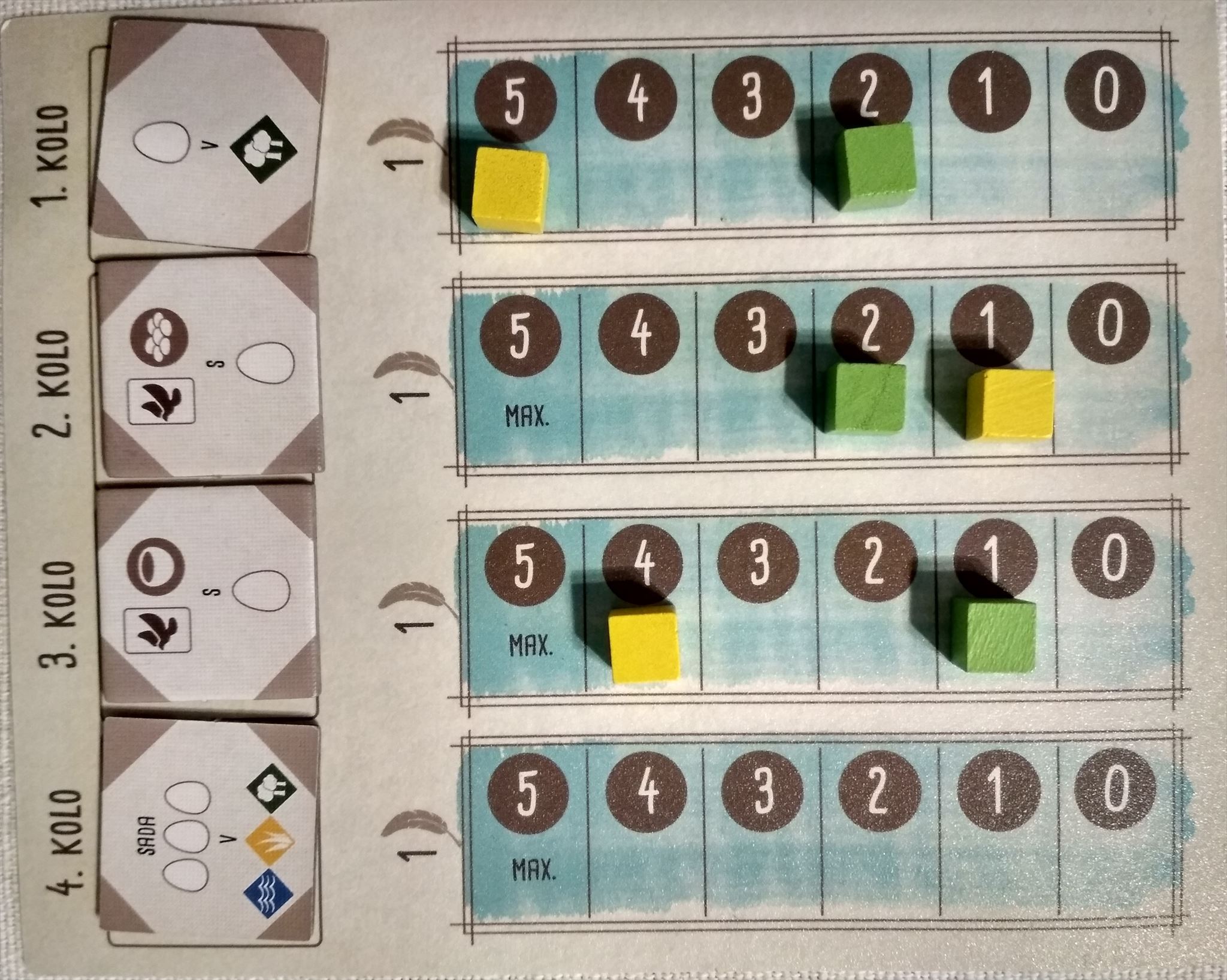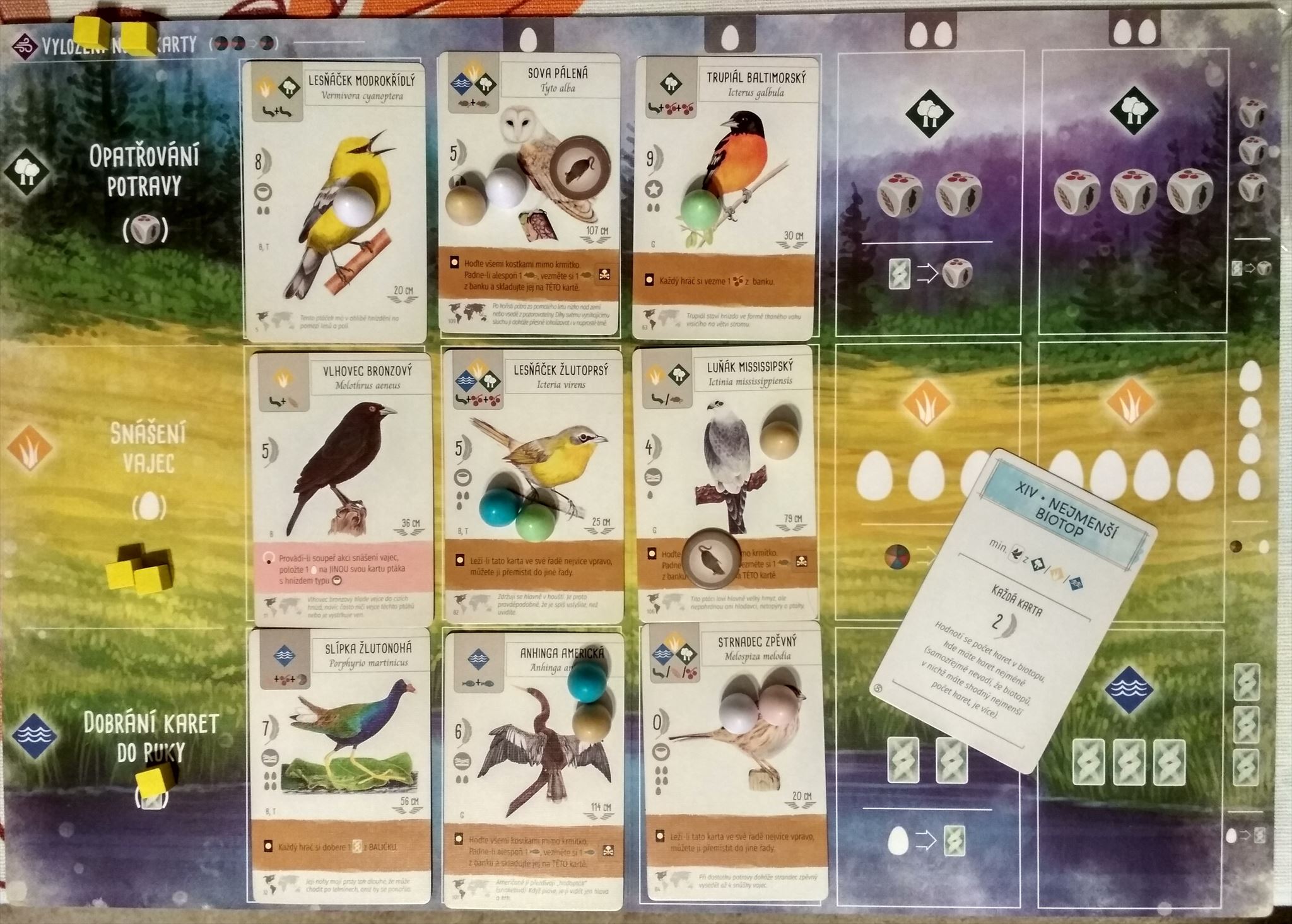 A tiež Tabuľku verejných úloh tesne pred vyhodnotením posledného štvrtého kola, v ktorom sa hodnotí, koľko trojíc vajec má hráč na doske, pričom každé vajce z trojice je uložené v inom vtáčom biotope. (Alebo jednoducho, počet vajec v tom biotope, kde je ich najmenej.) Treba teda prideliť každému hráčovi počet bodov za túto úlohu (virtuálnym) položením zelenej a žltej kocky do - zatiaľ prázdneho - 4. riadku na Tabuľke verejných úloh.