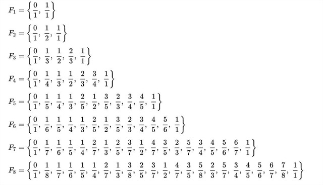 - Sucesión de Farey: Es una sucesión matemática de fracciones irreductibles entre 0 y 1 que tienen un denominador menor o igual a "n" en orden creciente. Cada sucesión de farey comienza en el 0, denotado por la fracción 0/1 , y termina en el 1, denotado por la fracción 1/1 , aunque algunos autores suelen omitir ambos términos. La sucesión de Farey para n entre 1 y 8 es la siguiente: