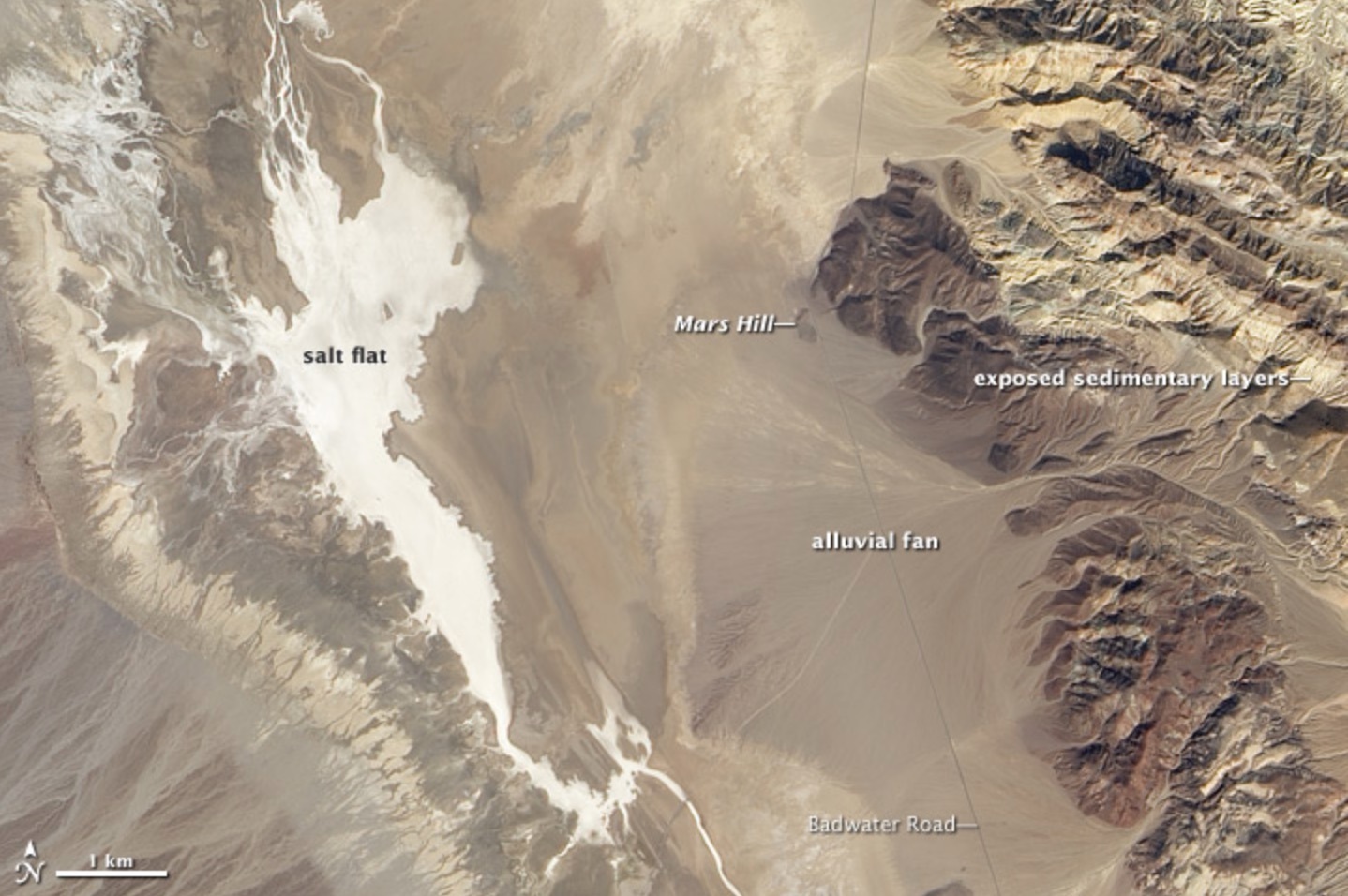 The salt pan on the left is another feature that makes this part of Death Valley interesting to Mars researchers. Badwater Basin and Gale Crater on Mars are both enclosed basins with no outflows, so the water flowing into them would form temporary lakes and eventually salt flats after the water evaporates.