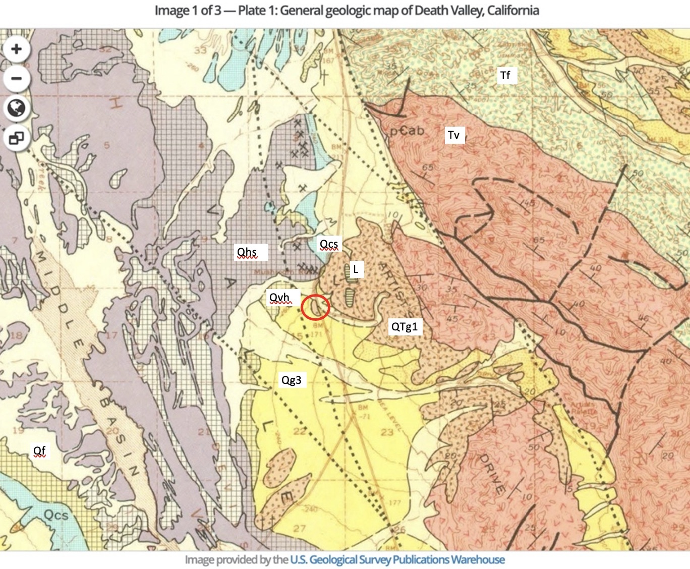 - Qg3: Fan gravel; silt and salt buried under floor of playa; perhaps 2,000 feet (600 m) thick.
