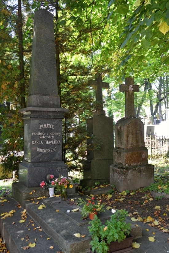 Starý hřbitov v Havlíčkově Brodě je bývalým městským hřbitovem a nachází se v Ledečské ulici kousek od centra města. Letopočet 1617 na vstupní renesanční bráně s městským znakem dává tušit, o jak starý hřbitov se jedná, přičemž současná podoba hřbitovního kostela sv. Vojtěcha se datuje do druhé poloviny 16. století. Na hřbitově se nachází několik památkově chráněných hrobů a nás bude samozřejmě zajímat hrob rodičů a dcery Karla Havlíčka Borovského. Pomník věnovaný jejich památce se nachází v těsné blízkosti kostela a hrobové místo je tvořené žulovým obrubníkem s náhrobní deskou a vysokým pylonem z černé leštěné žuly. Hrob zhotovila kamenická firma Louvar v Německém Brodě. Otec Matěj Havlíček se narodil 3.2.1792 a byl synem rolníka ve Velké Losenici. Svým úsilím se stal váženým kupcem v Německém Brodě. Zemřel 7.7.1844 ve věku 52 let. Matka Josefína Havlíčková, roz. Dvořáková se narodila 14.8.1791 do rodiny sládka v Horní Cerekvi a za Matěje Havlíčka se provdala 14.8.1818. Dožila se úctyhodných 92 let, zemřela 1.7.1884. Pomník "skromné matky velkého syna" nalezneme na žlutě značené turistické trase u rybníka Obora - jen kousek od pomníku KHB v parku Budoucnost. Dcera Zdenka Havlíčková se narodila 23.12.1848 a v raném mládí se stala sirotkem - v roce 1855 jí na tuberkulózu zemřela matka (Julie Havlíčková, roz. Sýkorová) a v roce 1856 na stejnou nemoc také otec. Zdenka Havlíčková nebyla spisovatelkou, nebyla umělkyní, nebyla bojovnicí za práva žen, a přece je v národě českém osobností tak význačnou, jak málo která jiná. Stačilo, že byla dcerou Karla Havlíčka a že tragický odchod jejích rodičů vytvořil tragiku jejího života. Bez ohledu na její milostný skandál, kvůli kterému ji veřejné mínění pražské na čas zavrhlo. Dlouhého života jí však dopřáno nebylo, zemřela na stejnou nemoc jako její rodiče 20.9.1872 ve věku 23 let. Zemřela u své babičky Josefíny v Německém Brodě, která tak po manželovi, snaše a synovi pochovala také svou vnučku.