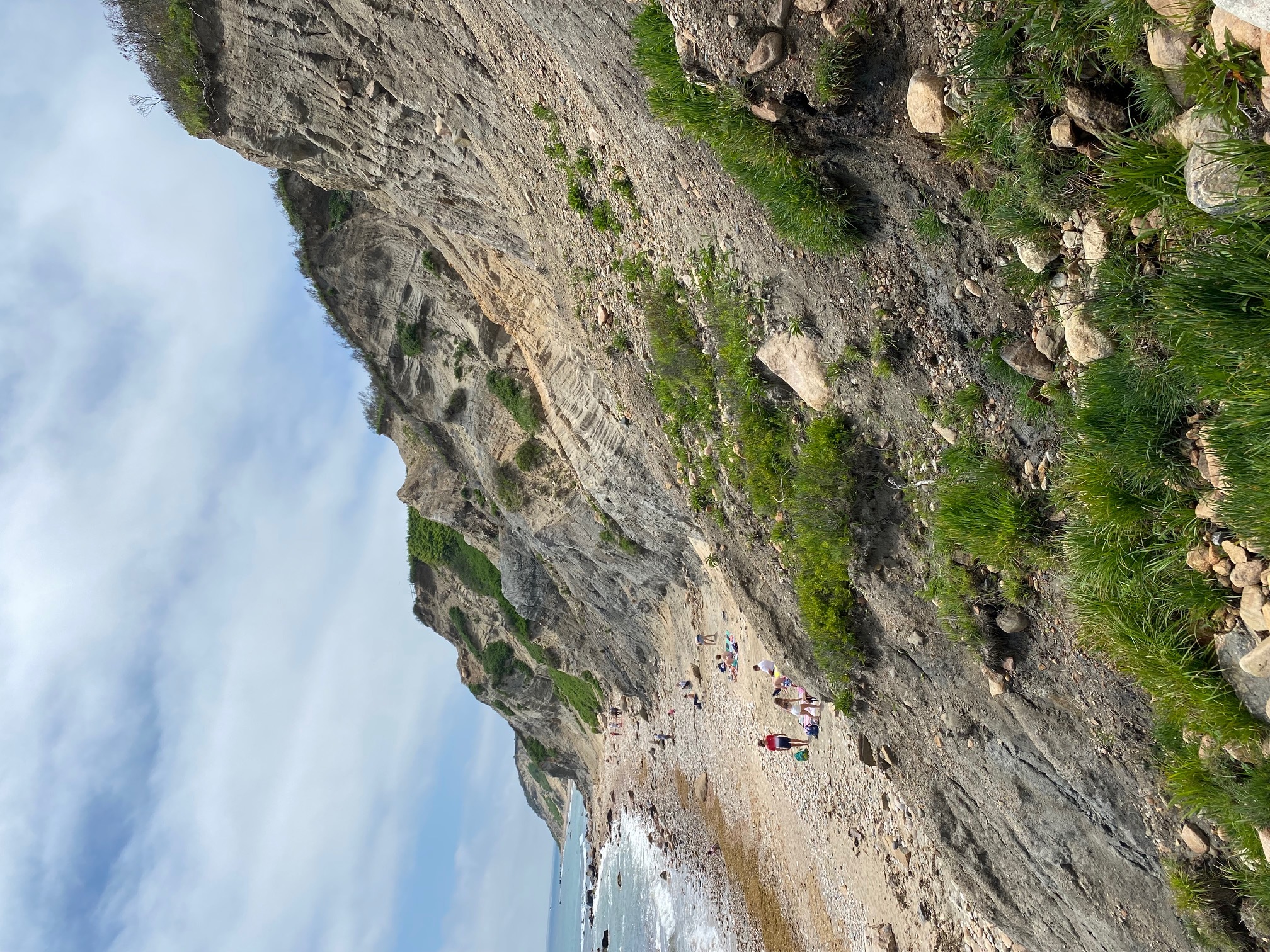 The three main types of particles that make up soil are sand, silt, and clay. You may be wondering, how can you observe soil here if you are standing on a beach? Soil is defined as the layers of weathered particles of earth material that contain organic matter and can support vegetation. While it may not be obvious at first, sand is a type of soil. Sand, silt, and clay are distinguished by the size of their particles, clay is the smallest (<0.002 mm), next is silt (0.05 to 0.002mm), and then there is sand (2 to 0.05 mm). Anything larger than sand for the purpose of this earthcache we can consider gravel. An easy way to distinguish them is that sandy soils feel gritty when rubbed between your fingers. Silts feel smooth and a little like flour. Most clays are sticky and moldable. Where the ground water has a high concentration of iron, the clay appears red. The clays of the southern end of the island tend to the darker, bluer part of the spectrum. The clays of Clay Head are lighter; in some places, white outcroppings of ancient cretaceous clay can be seen.