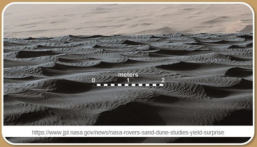 Aus Beobachtungen des NASA-Marsrovers Curiosity weiß man, dass es auch auf dem Mars Rippel gibt. Erde und Mars haben beide große Sanddünen und kleine Sandrippel, aber auf dem Mars gibt es etwas dazwischen, das wir auf der Erde nicht haben. Die Forscher entdeckten auf dem Mars in den Bagnold-Dünen, dass die Scheitellinien der metergroßen Riffeln gewunden sind. Anders als Rippel z.B. in Dünen mit einem gleichmäßigem Scheitel, sind die Rippel auf dem Mars mit Rippel im Sand unter bewegtem Wasser wie hier in Zingst zu vergleichen. Anders als auf der Erde brachte Curiosity die Erkenntnis, dass die Rippel auf dem Mars bis zu 3 Meter Abstand voneinander haben. Daraus schlussfolgern die Forscher, dass sich die Atmosphäre auf dem Mars über Millionen Jahre hinweg verändert hat. Die Größe dieser Rippel hängt mit der Dichte der Flüssigkeit zusammen, die die Körner bewegt, und diese Flüssigkeit ist die Marsatmosphäre. Es wird daher vermutet, dass der Mars in der Vergangenheit eine dickere Atmosphäre hatte, die kleinere Windrippel gebildet oder sogar ihre Bildung ganz verhindert haben könnte. Daher könnte die Größe der erhaltenen Windrippel, die in Marssandsteinen gefunden wurden, die Ausdünnung der Atmosphäre aufgezeichnet haben.
