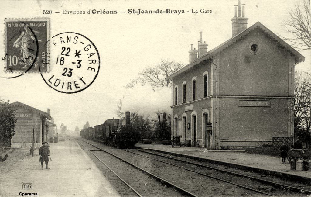 Opérationnelle en 1883, la gare de Saint Jean de Braye était située sur la ligne Orléans-Gien. Pendant une cinquantaine d'années, elle servit pour le transport de marchandises et des voyageurs, puis la concurrence de l'automobile et des autocars provoqua la fermeture du service voyageurs en 1939.