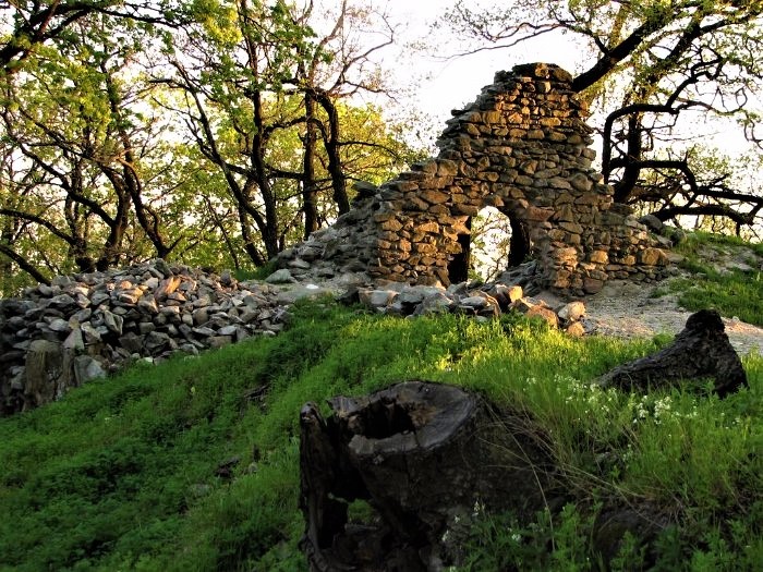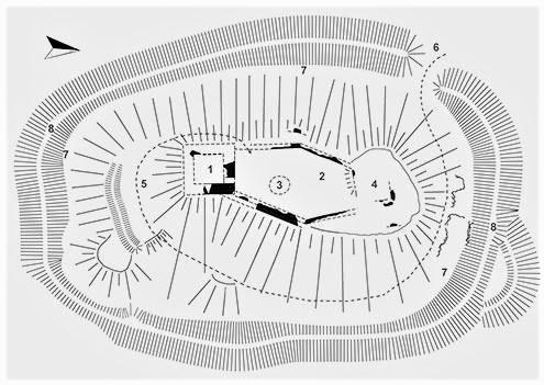 1 - obranná hranolová veža, 2 - nádvorie, 3 - cisterna, 4 - palácová stavba, 5 - obranný val, 6 - pravdepodobný vstup, 7 - priekopa, 8 - kamenná hradba