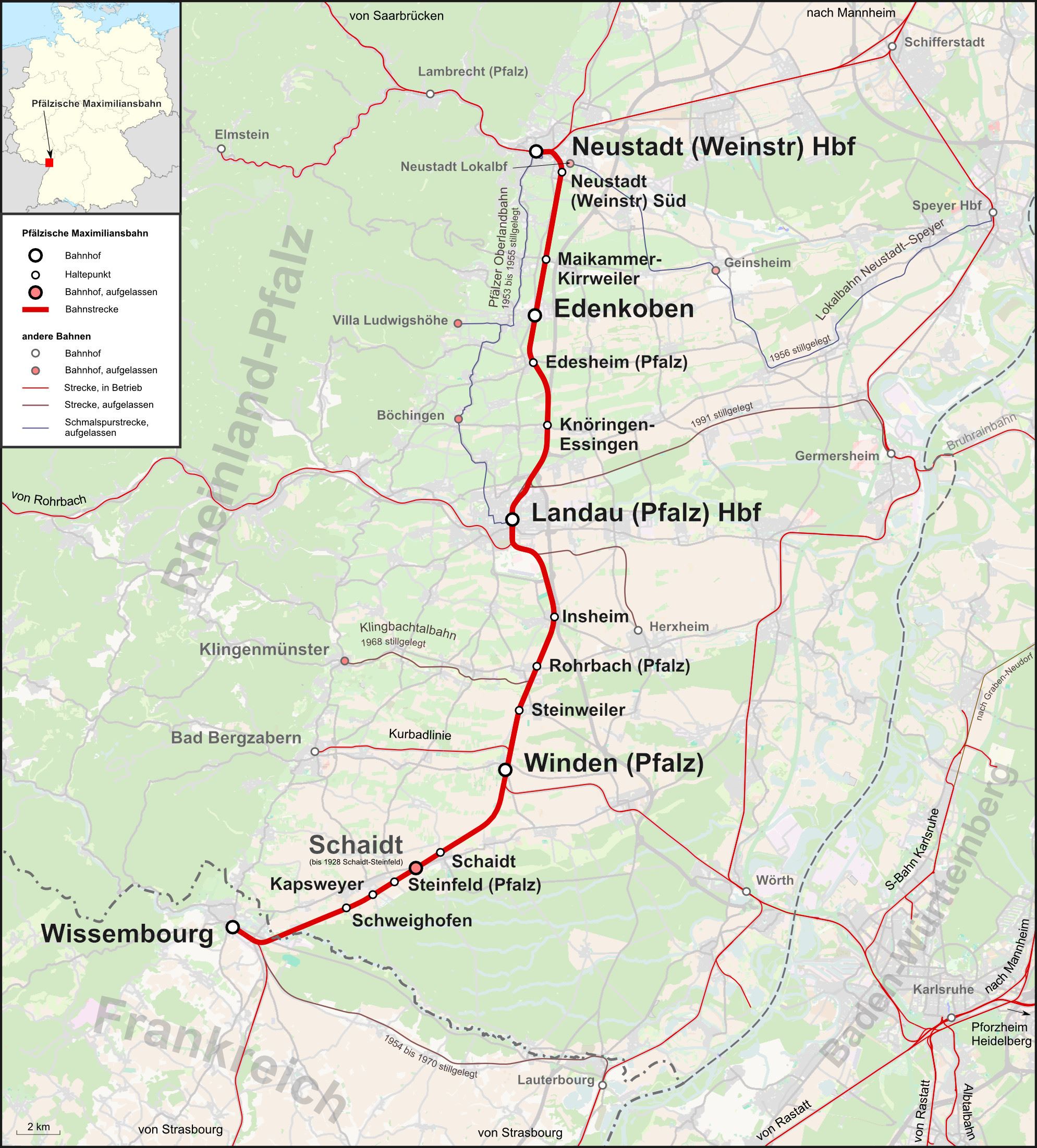 Die Bahnstrecke Neustadt–Wissembourg, vor allem im 19. Jahrhundert „Pfälzische Maximiliansbahn“ oder „Maxbahn“ genannt, ist eine Bahnstrecke in Rheinland-Pfalz und zu einem kleinen Teil im französischen Elsass. Sie verläuft von Neustadt an der Weinstraße über Landau in der Pfalz und Winden (Pfalz) nach Wissembourg (deutsch: Weißenburg). Den Namen „Maximiliansbahn“ erhielt sie von der Pfälzischen Maximiliansbahn-Gesellschaft, welche die Bahn gebaut hat, und als deren Stammstrecke sie fungierte. Sie wurde nach dem damals regierenden bayerischen König Maximilian II. benannt. Seit den 1990er Jahren wird der historische Name „Pfälzische Maximiliansbahn“ vor allem vonseiten der Deutschen Bahn wieder benutzt und zusätzlich auf die benachbarte Bahnstrecke Winden–Karlsruhe angewendet. In den ersten Jahrzehnten diente die Strecke vor allem dem Kohletransport ins Elsass und in die Schweiz. Zudem war sie Teil einer Fernverkehrsmagistrale in Nord-Süd-Richtung. Sowohl im Deutsch-Französischen Krieg als auch im Ersten und Zweiten Weltkrieg erlangte sie strategische Bedeutung. Durch die dauerhafte Zugehörigkeit des Elsass zu Frankreich nach den beiden Weltkriegen verlor die Strecke die Bedeutung für den Fernverkehr. Darüber hinaus orientierten sich die Verkehrsströme ab Winden vom Ende der 1930er Jahre an zunehmend in Richtung Karlsruhe. Als Folge dieser Entwicklungen geriet vor allem der Abschnitt Winden– Wissembourg ins Abseits. Dort wurde der Personenverkehr 1975 eingestellt, jedoch 1997 reaktiviert. Inzwischen dient die gesamte Strecke von Neustadt bis Wissembourg ausschließlich dem Regionalverkehr. Der Güterverkehr wurde ab den 1980er Jahren deutlich reduziert und beschränkt sich auf den Abschnitt Neustadt–Landau.