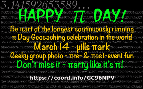 Come join us and meet in Mills Park and celebrate this most wonderful, geekiest day of the year! Optionally, wear your geekiest garb. Get ready for some Mathy Pi Day fun. This all-outdoor event will be held rain or shine.
