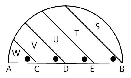 半径5cmの半円を4つの直線によってS、T、U、V、Wの5つの部分に分けます。図の点C、D、Eは直径ABを4等分する点です。●印がついた4つの角の大きさはいずれも45度です。円周率を3.14とすると、Sの面積はa.bcd (cm^2)、TとVの面積の和からUとWの面積の和を引くと、e.fg (cm^2)となります。